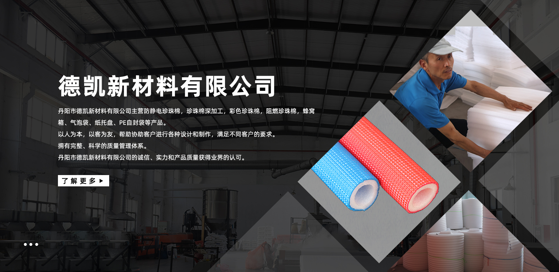 丹陽市德凱新材料有限公司主營防靜電珍珠棉,珍珠棉深加工,彩色珍珠棉,阻燃珍珠棉,蜂窩箱、氣泡袋、紙托盤、PE自封袋等產品專業生產加工的公司,丹陽市德凱新材料有限公司以人為本,以客為友,幫助協助客戶進行各種設計和制作,滿足不同客戶的要求。擁有完整、科學的質量管理體系。丹陽市天盛包裝材料有限公司的誠信、實力和產品質量獲得業界的認可。